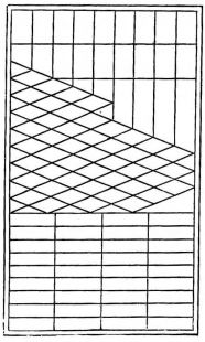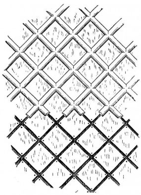 In the cities, the outside walls of more durable structures, such as warehouses, are not infrequently covered with square tiles, a board wall being first made, to which the tiles are secured by being nailed at their corners. These may be placed in diagonal [pg 33] or horizontal rows,—in either case an interspace of a quarter of an inch being left between the tiles, and the seams closed with white plaster, spreading on each side to the width of an inch or more, and finished with a rounded surface. This work is done in a very tasteful and artistic manner, and the effect of the dark-gray tiles crossed by these white bars of plaster is very striking (fig. 25).