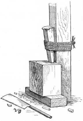 It may be interesting, in this connection, to mention a few of the principal tools one commonly sees in use among the Japanese carpenters. After having seen the good and serviceable carpentry, the perfect joints and complex mortises, done by good Japanese workmen, one is astonished to find that they do their work without the aid of certain appliances considered indispensable by similar craftsmen in our country. They have no bench, no vise, no spirit-level, and no bit-stock; and as for labor-saving machinery, they have absolutely nothing. With many places which could be utilized for water-power, the old country saw-mill has not occurred to them.8 Their tools appear to be roughly made, and of primitive design, though evidently of the best-tempered steel. The only substitute for the carpenter's bench is a plank [pg 38] on the floor, or on two horses; a square, firm, upright post is the nearest approach to a bench and vise, for to this beam a block of wood to be sawed into pieces is firmly held (fig. 26). A big wooden wedge is bound firmly to the post with a stout rope, and this driven down with vigorous blows till it pinches the block which is to be cut into the desired proportions.