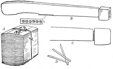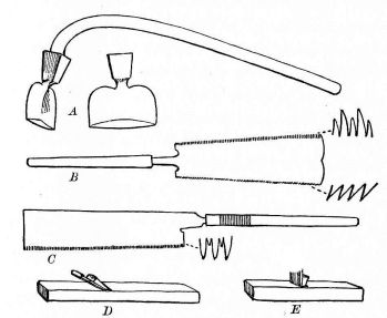 The adze is provided with a rough handle bending considerably at the lower end, not unlike a hockey-stick (fig. 27, A). In summer the carpenters work with the scantiest clothing possible, and nearly always barefooted. It is a startling sight to a nervous man to see a carpenter standing on a stick of timber, hacking away in a furious manner with this crooked-handled instrument having an edge as sharp as a razor, and taking off great chips of the wood within an inch of his naked toes. Never having ourselves seen a toeless carpenter, or one whose feet showed the slightest indication of his ever having missed the mark, we regarded as good evidence of the unerring accuracy with which they use this serviceable tool.