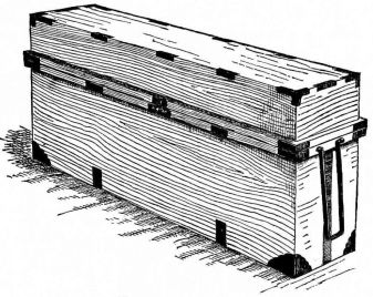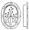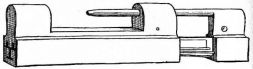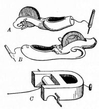 There are three implements of the Japanese carpenter which are inseparable companions; these are the magari-gane, sumi-sashi, and sumi-tsubo. The magari-gane is an iron square rather narrower than our square. The sumi-sashi is a double-ended brush made out of fibrous wood, rounded at one end, and having a wide sharp edge at the other (fig. 29). The carpenter always has with him a box containing cotton saturated with ink; by means of the sumi-sashi and ink the carpenter can mark characters and signs with the rounded end, or fine black lines with the sharp edge. One, advantage attending this kind of a brush is that the carpenter can make one at a moment's notice. The sumi-tsubo(fig. 30, A, B) is the substitute for our carpenter's chalk-line; it is made of wood, often curiously wrought, having at one end a cavity scooped out and filled with cotton saturated with ink, and the other end has a reel with a little crank. Upon the reel is wound a long cord, the free end of which passes through the cotton and out through a hole at the end of the instrument. To the end of the cord is secured an object resembling an awl. To make a line on a plank or board the awl is driven into the wood, the cord is unreeled, and in this act it becomes blackened with ink; by snapping the cord in the usual way, [pg 42] a clear black line is left upon the surface of the wood. It is then quickly reeled up again by means of a little crank. This instrument is an improvement in every way over the chalk-line, as it is more convenient, and by its use a clear black line is left upon the wood, instead of the dim chalk-line which is so easily effaced. This implement is often used as a plumb-line by giving a turn to the cord about the handle, thus holding it firmly, and suspending the instrument by means of the awl.