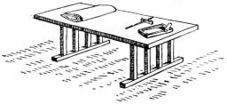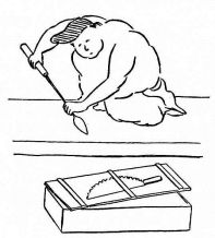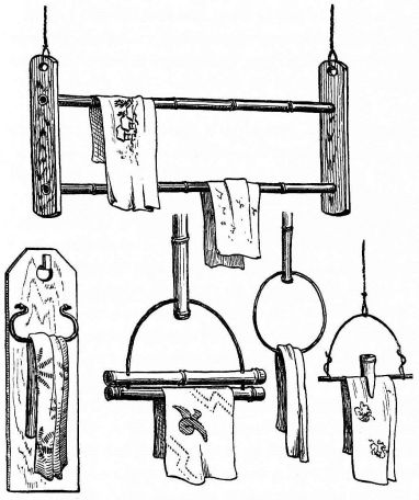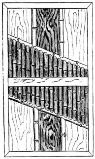 In gluing pieces of wood together, more especially veneers, the Japanese resort to a device which is common with American cabinet-makers,—of bringing into play a number of elastic or bamboo rods, one end [pg 43] coming against a firm ceiling or support, and the other end pressing on the wood to be united. In polishing and grinding, the same device is used in getting pressure.