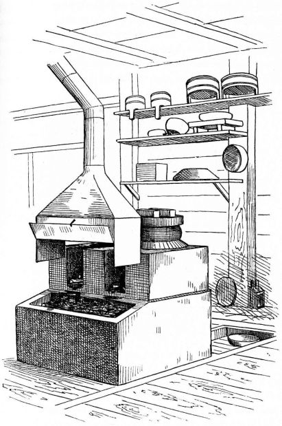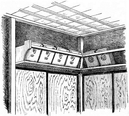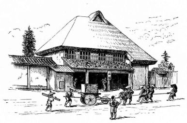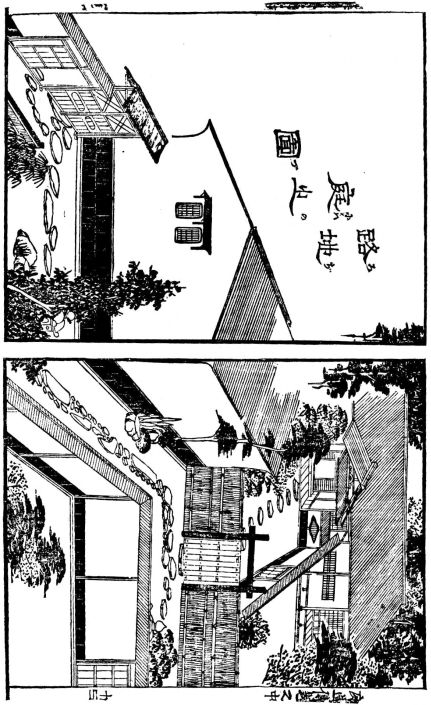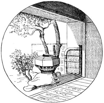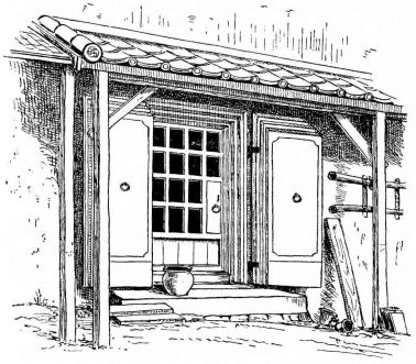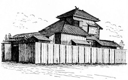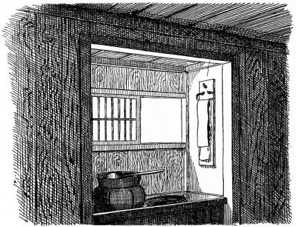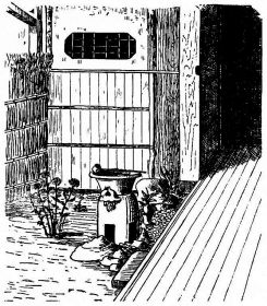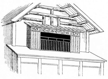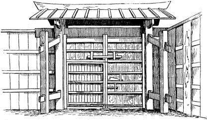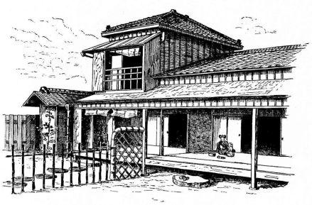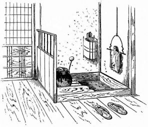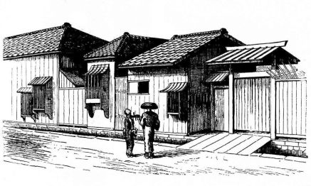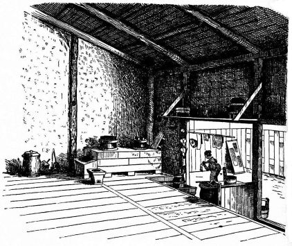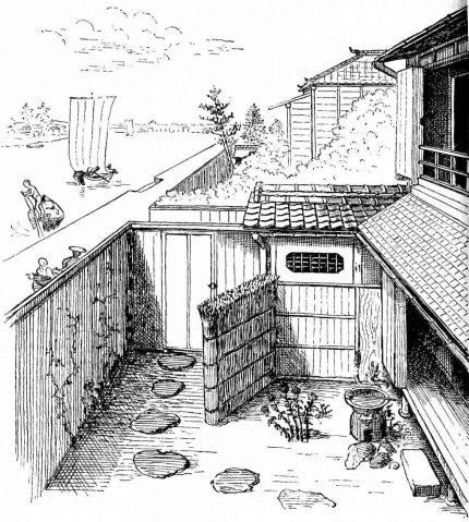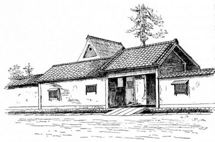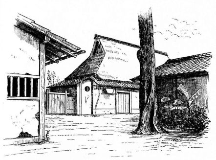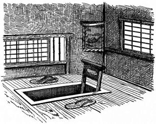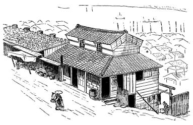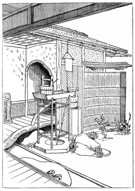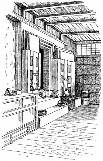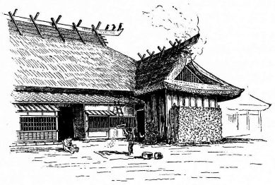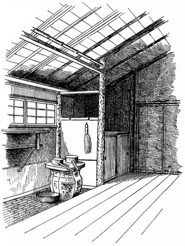 In city houses the kitchen is at one side or corner of the house; generally in an L, covered with a pent roof. This apartment is often towards the street, its yard separated from other areas by a high fence. In the country the kitchen is nearly always under the main roof. In the city few out-buildings such as sheds and barns are seen. Accompanying the houses of the better class are solid, thick-walled, one or two storied, fire-proof buildings called kura, in which the goods and chattels are stored away at the time of a conflagration. These buildings, which are known to the foreigners as “godowns,” have one or two small windows and one door, closed by thick and ponderous shutters. Such a building usually stands isolated from the dwelling, though often in juxtaposition; and sometimes, though rarely, it is used as a domicile.