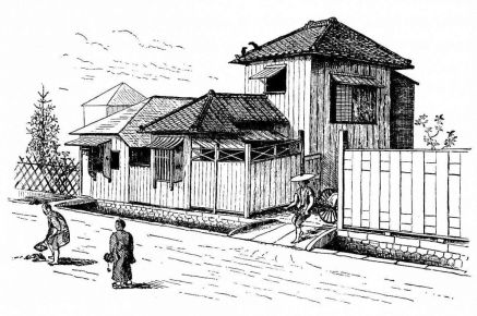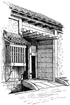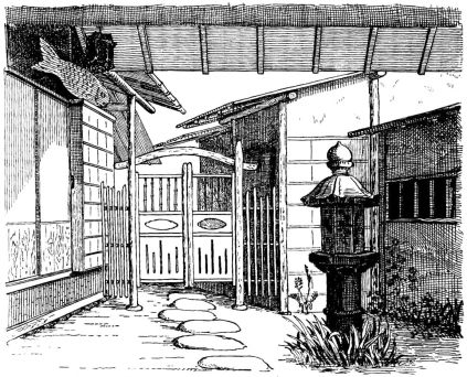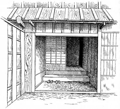 In Tokio, the houses that abut directly on the street have a close and prison-like aspect. The walls are composed of boards or plaster, and perforated with one or two small windows lightly barred with bamboo, or heavily barred with square wood-gratings. The entrance to one of these houses is generally at one corner, or at the side. The back of the house and one side, at least, have a verandah. I speak now of the better class of houses in the city, but not of the best houses, which almost invariably stand back from the street and are surrounded by gardens.