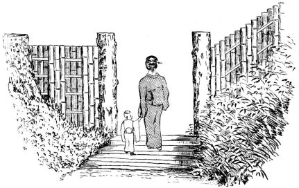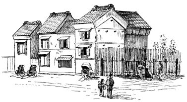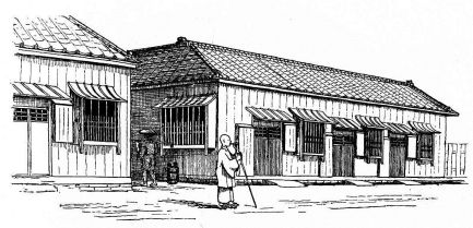On the business streets similar rows of buildings are seen, though generally each shop is an independent building, abutting directly to the next; and in the case of all the smaller shops, and indeed of many of the larger ones, the dwelling and shop are one, the goods being displayed in the room on the street, while the family occupy the back rooms. While one is bartering at a shop, the whole front being open, he may often catch a glimpse of the family in the back room at dinner, and may look [pg 54] entirely through a building to a garden beyond. It is a source of amazement to a foreigner to find in the rear of a row of dull and sombre business-houses independent dwellings, with rooms of exquisite taste and cleanliness. I remember, in one of the busiest streets of Tokio, passing through a lithographer's establishment, with the inky presses and inky workmen in full activity, and coming upon the choicest of tiny gardens and, after crossing a miniature foot-bridge, to a house of rare beauty and finish. It is customary for the common merchant to live under the same roof with the shop, or in a closely contiguous building; though in Tokio, more than elsewhere, I was informed it is the custom among the wealthy merchants to have their houses in the suburbs of the city, at some distance from their place of business.