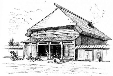 The country house, if anything more than a shelter from the elements, is larger and more substantial than the city house, and with its ponderous thatched roof and elaborate ridge is always picturesque. One sees much larger houses in the north,—roofs of grand proportions and an amplitude of space beneath, that farther south occurs only under the roofs of temples. We speak now of the houses of the better classes, for the poor farm-laborer and fisherman, as well as their prototypes in the city, possess houses that are little better than shanties, built, as a friend has forcibly expressed it, of “chips, paper, and straw.” But even these huts, clustered together as they oftentimes are in the larger cities, are palatial in contrast to the shattered and filthy condition of a like class of tenements in many of the cities of Christian countries.