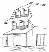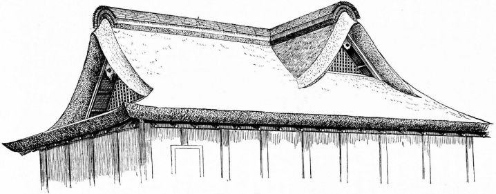 Owing to the former somewhat isolated life of the different provinces, the style of building in Japan varies considerably; and this is more particularly marked in the design of the roof and ridge. Though the Japanese are conservative in many things concerning the house, it is worthy of note that changes have taken place in the house architecture within two hundred and fifty years; at all events, houses of the olden times have much heavier beams in their frame and wider planks in their structure, than have the houses of more recent times. [pg 49] A probable reason is that wood was much cheaper in past times; or it is possible that experience has taught them that sufficiently strong houses can be made with lighter material.