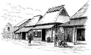 It is a curious fact that one may ride long distances in the country without passing a single dwelling, and then abruptly enter a village. The entrance to a village is often marked by a high mound of earth on each side of the road, generally surmounted by a tree; or perhaps the evidences of an old barrier are seen in the remains of gate-posts or a stone-wall. Having passed through the village one enters the country again, with its rice-fields and cultivated tracts, as abruptly as he had left it. The villages vary greatly in their appearance: some are extremely trim and pretty, with neat flower-plats in front of the houses, and an air of taste and comfort everywhere apparent; other villages present marked evidences of poverty, squalid houses with dirty children swarming about them. Indeed, the most striking contrasts are seen between the various villages one passes through in a long overland trip in Japan.