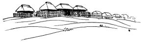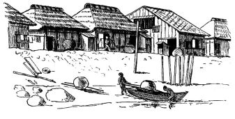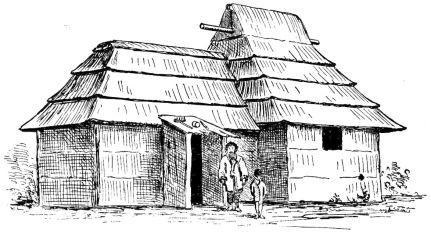 The verandah is quite spacious; and in line with the division between the rooms is a groove for the adjustment of a wooden screen or shutter when it is desired to separate the house into two portions temporarily. At the end of the verandah to the left of the sketch is the latrine. The house is quite open beneath, and the air has free circulation.