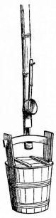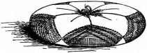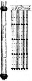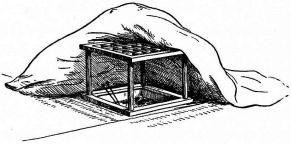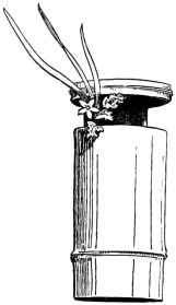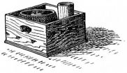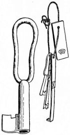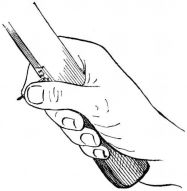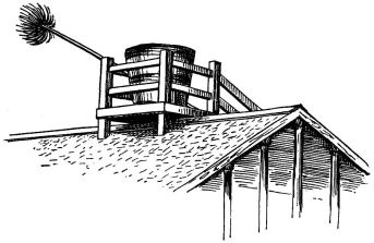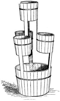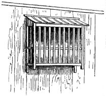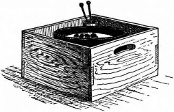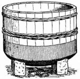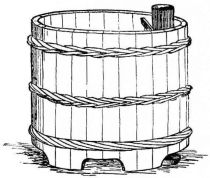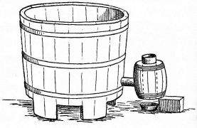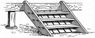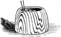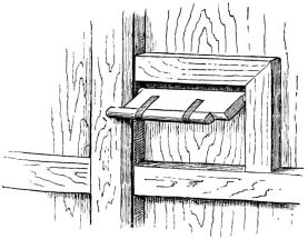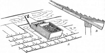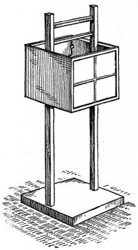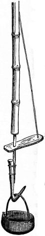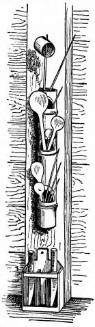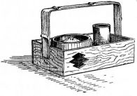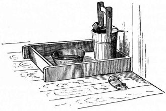 A portable nail-box is used in the shape of a round basket, to which is attached a short cord with a button of wood or [pg 41] bamboo at the end; this is suspended from a sash or cord that encircles the waist (fig. 28). The shingler's nail-box has the bottom prolonged and perforated, so that it may be temporarily nailed to the roof (fig. 64).