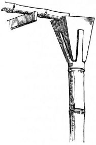 [pg 22] [pg 23]Diagonal bracing in the frame-work of a building is never seen. Sometimes, however, the uprights in a weak frame are supported by braces running from the ground at an acute angle, and held in place by wooden pins (fig. 13). Outside diagonal braces are sometimes met with as an ornamental feature. In the province of Ise one often sees a brace or bracket made out of an unhewn piece of timber, generally the proximal portion of some big branch. This is fastened to an upright, and appears to be a brace to hold up the end of a horizontal beam that projects beyond the eaves. These braces, however, are not even notched [pg 24] into the upright, but held in place by square wooden pins, and are of little use as a support for the building, though answering well to hold fishing-rods and other long poles, which find here convenient lodgment (fig. 14).