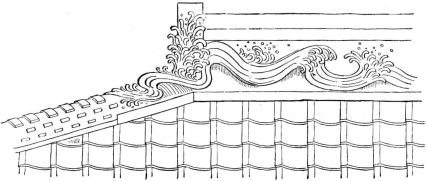 Where external walls appear they are of wood unpainted, or painted black; and if of plaster, white or dark slate colored. In certain classes of buildings the outside wall, to a height of several [pg 8] feet from the ground, and sometimes even the entire wall, may be tiled, the interspaces being pointed with white plaster. The roof may be either lightly shingled, heavily tiled, or thickly thatched. It has a moderate pitch, and as a general thing the slope is not so steep as in our roofs. Nearly all the houses have a verandah, which is protected by the widely-overhanging eaves of the roof, or by a light supplementary roof projecting from beneath the eaves.