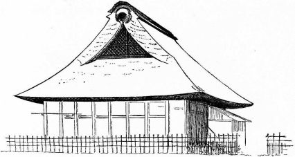 Fig. 39 gives a house of this description near Matsushima, in Rikuzen. An opening for the egress of smoke occurs on the side of the roof, in shape not unlike that of a round-topped dormer window. This opening in almost every instance is found on the gable end, directly beneath the angle formed at the peak of the roof.