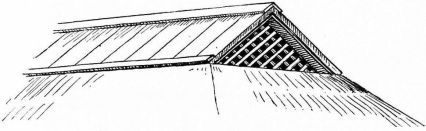 In the case of a wide gable-roof there are many ways to support the frame, one of which is illustrated in the following outline (fig. 10). Here a stout stick of timber runs from one end of the house to the other on a vertical line with the ridge-pole, and on a level with the eaves. This stick is always crowning, in order to give additional strength. A few thick uprights start from this to support the ridge-pole above; from these uprights beams run to the eaves; these are mortised into the uprights, but at different levels on either side in order not to weaken the uprights by the mortises. From these beams run short supports to the horizontal rafters above.