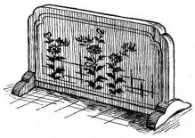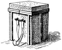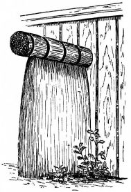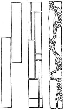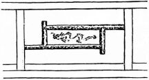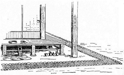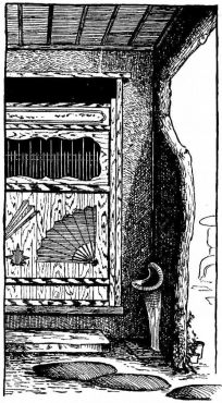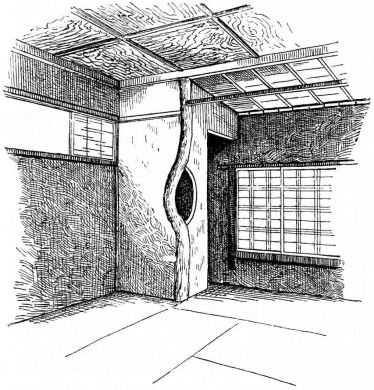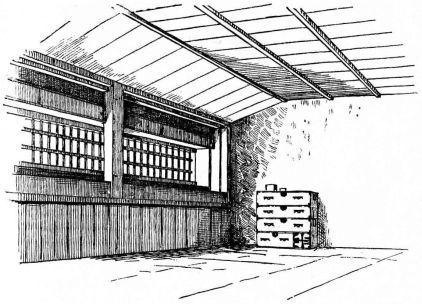 Many of the partitions between the rooms consist entirely of light sliding screens, which will be specially described farther on. Often two or more sides of the house are composed entirely of these simple and frail devices. The outside permanent walls of a house, if of wood, are made of thin boards nailed to the frame horizontally,—as we lay clapboards on our houses. These may be more firmly held to the house by long strips nailed against the boards vertically. The boards may also be secured to the house vertically, and weather-strips nailed over the seams,—as is commonly the way with certain of our houses. In the southern provinces a rough house-wall is made of wide slabs of bark, placed vertically, and held in place by thin strips of bamboo nailed cross-wise. This style is common among the poorer houses in Japan; and, indeed, in the better class of houses it is often used as an ornamental feature, placed at the height of a few feet from the ground.