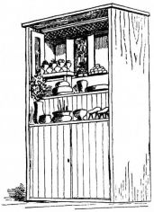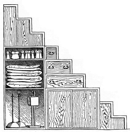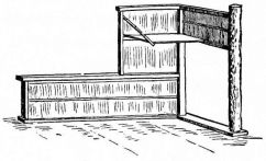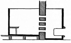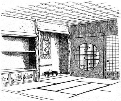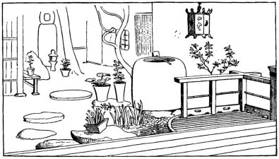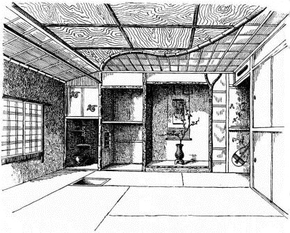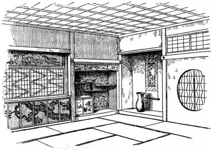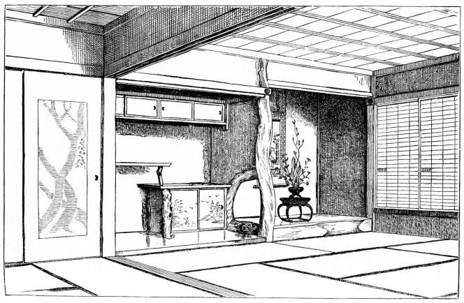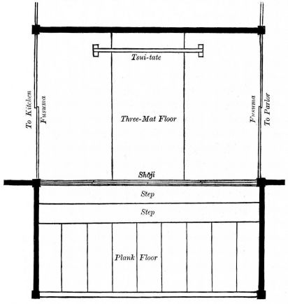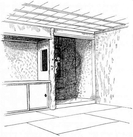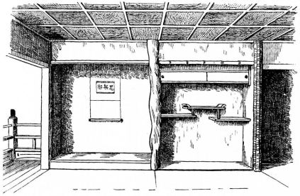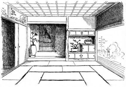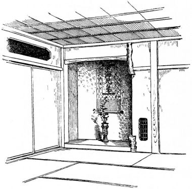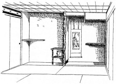 While most houses of the better class have a definite porch and vestibule, or genka, in houses of the poorer class this entrance is not separate from the living room; and since the interior of the house is accessible from two or three sides, one may enter it from any point. The floor is raised a foot and a half or more from the ground, and is covered with thick straw mats, rectangular in shape, of uniform size, with sharp square edges, and so closely fitted that the floor upon which they rest is completely hidden. The rooms are either square or rectangular, and are made with absolute reference to the number of mats they are to contain. With the exception of the guest-room few rooms have projections or bays. In the guest-room there is at one side a more or less deep recess divided into two bays by a slight partition; the one nearest the verandah is called the tokonoma. In this place hang one or more pictures, and upon its floor, which is slightly raised above the mats, rests a flower vase, incense burner, or some other object. The companion bay has shelves and a low closet. Other rooms also may have recesses to accommodate a case of drawers or shelves. Where closets and cupboards occur, they are finished with sliding screens instead of swinging doors. In tea-houses of two stories the stairs, which often ascend from the vicinity of the kitchen, have beneath them a closet; and this is usually closed by a swinging door.