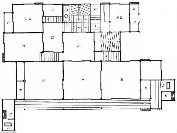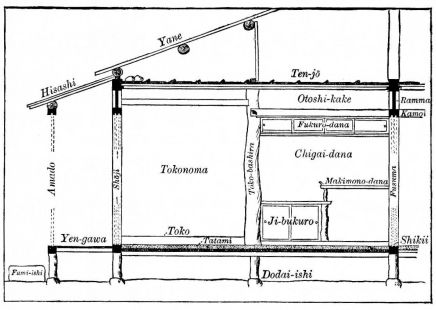 In connection with the statement just made, that it is difficult to recognize any special types of architecture in Japanese dwellings, it may be interesting to mention that we found it impossible to get books in their language treating of house architecture. Doubtless books of this nature exist,—indeed, they must exist; but though the writer had a Japanese bookseller, and a number of intelligent friends among the Japanese, looking for such books, he never had the good fortune to [pg 48] secure any. Books in abundance can be got treating of temple architecture, from the plans of the framing to the completed structure; also of kura, or go-downs, gateways, tori-i, etc. Plans of buildings for their tea-ceremonies, and endless designs for the inside finish of a house,—the recesses, book-shelves, screens, and indeed all the delicate cabinet-work,—are easily obtainable; but a book which shall show the plans and elevations of the ordinary dwelling the writer has never yet seen. A number of friends have given him the plans of their houses as made by the carpenter, but there were no elevations or details of outside finish represented. It would seem as if, for the ordinary houses at least, it were only necessary to detail in plan the number and size of the rooms, leaving the rest of the structure to be completed in any way by the carpenter, so long as he contrived to keep the rain out.