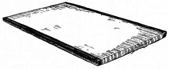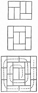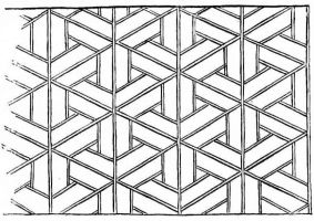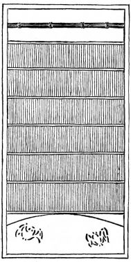 Special details of the room will be described in other chapters. It may be well to state here, however, that in the finish of the interior the daiku, or carpenter, has finished his work, and a new set of workmen, the sashi-mono-ya, or cabinetmakers, come in,—the rough framing and similar work being done by the carpenter proper. Great care is taken to secure wood that matches in grain and color; and this can be done only by getting material that has come from the same log. In the lumberyard one notices boards of uniform lengths tied up in bundles,—in fact tied up in precisely the same position that the wood [pg 26] occupied in the trunk before it was sawed into boards (fig. 18). So with other wood material,—the pieces are kept together in the same manner. One never sees in a lumber-yard a promiscuous pile of boards, but each log having been cut into boards is securely tied without displacement. As the rooms are made in sizes corresponding to the number of mats they are to contain, the beams, uprights, rafters, flooring-boards, boards for the ceiling, and all strips are got out in sizes to accommodate these various dimensions. The dimensions of the mats from one end of the Empire to the other are approximately three feet wide and six feet long; and these are fitted compactly on the floor. The architect marks on his plan the number of mats each room is to contain,—this number defining the size of the room; hence the lumber used must be of definite lengths, and the carpenter is sure to find these lengths at the lumber-yard. It follows from this that but little waste occurs in the construction of a Japanese house. Far different is it with us in our extravagant and senseless methods of house-building. In our country, a man after building a wooden house finds his cellar and shed choked to repletion with the waste of his new house, and for a year or more at least has the grim comfort of feeding [pg 27] his fireplaces and kitchen stove with rough and finished woods which have cost him at the rate of four to eight cents per square foot!