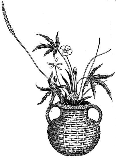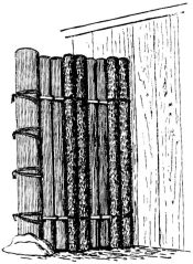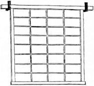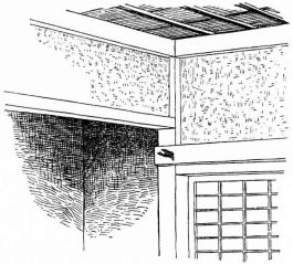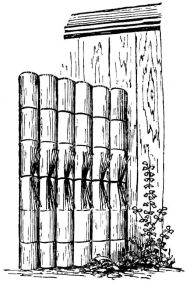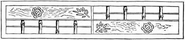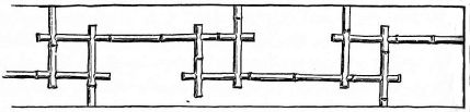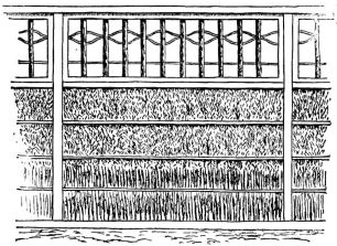 The permanent partitions within the house are made in various ways. In one method, bamboo strips of various lengths take the place of laths. Small bamboos are first nailed in a vertical position to the wooden strips, which are fastened from one upright to another; narrow strips of bamboo are then secured across these bamboos by means of coarse cords of straw, or bark fibre (fig. 4). This partition is not unlike our own plaster-and-lath partition. Another kind of partition may be of boards; and against these small bamboo rods are nailed quite close together, and upon this the plaster is put. Considerable pains are taken as to the plastering. The plasterer brings to the house samples of various-colored [pg 32] sands and clays, so that one may select from these the color of his wall. A good coat of plaster comprises three layers. The first layer, called shita-nuri, is composed of mud, in which chopped straw is mixed; a second layer, called chu-nuri, of rough lime, mixed with mud; the third layer, called uwa-nuri, has the colored clay or sand mixed with lime,—and this last layer is always applied by a skilful workman. Other methods of treating this surface will be given in the chapter on interiors.