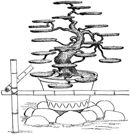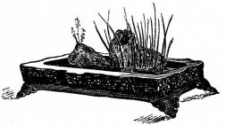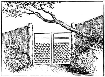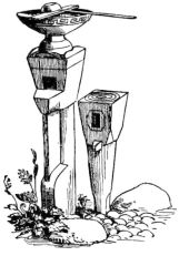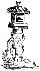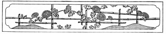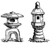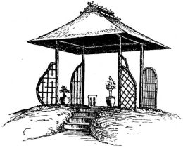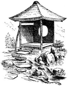 In the gardens of the better classes summer-houses and shelters of rustic appearance and diminutive proportions are often seen. Rustic arbors are also to be seen in the larger gardens. Specially constructed houses of quaint design and small size are not uncommon; in these the ceremonial tea-parties take place. High fences, either of board or bamboo, or solid walls of mud or tile with stone foundations, surround the house or enclose it from the street. Low rustic fences border the gardens in the suburbs. Gateways of various styles, some of imposing design, form the entrances; as a general thing they are either rustic and light, or formal and massive.