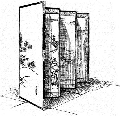 One of the chief points of difference in a Japanese house as compared with ours lies in the treatment of partitions and outside walls. In our houses these are solid and permanent; and when the frame is built, the partitions form part of the framework. In the Japanese house, on the contrary, there are two or more sides that have no permanent walls. Within, also, there are but few partitions which have similar stability; in their stead are slight sliding screens which run in appropriate grooves in the floor and overhead. These grooves mark the limit of each room. The screens may be opened by sliding them back, or they may be entirely removed, thus throwing a number of rooms into one great apartment. In the same way the whole side of a house may be flung open to sunlight and air. For communication between the rooms, therefore, swinging doors are not necessary. As a substitute for windows, the outside screens, or shōji, are covered with white paper, allowing the light to be diffused through the house.
