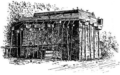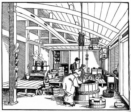 As the fire-proof buildings, or kura, are often used as dwelling—places, a brief mention of their structure may be proper here. These buildings are specially designed for fire-proof storehouses. They are generally two stories in height, with walls eighteen inches to two feet or more in thickness, composed of mud plastered on to a frame-work of great strength and solidity. The beams are closely notched, and bound with a coarse-fibred rope; and small bamboos are closely secured to the beams. Short coarse-fibred ropes, a foot in length, are secured in close rows to the crossbeams and uprights. All these preparations are made for the purpose of more securely holding the successive layers of mud [pg 34] to be applied. As a preliminary to this work a huge and ample staging is erected to completely envelop the building. The staging, indeed, forms a huge cage, and upon this straw mattings are hung so that the mud plastering shall not dry too quickly. This cage is sufficiently ample to allow the men to work freely around and beneath it. Layer after layer is applied, and a long time elapses between these applications, in order that each layer may dry properly. Two years or more are required in the proper construction of one of these fire-proof buildings. The walls having been finished, a coat of plaster, or a plaster mixed with lamp-black, is applied, and a fine polished surface, like black lacquer, is produced. This polished black surface is made by first rubbing with a cloth, then with silk, and finally with the hand.