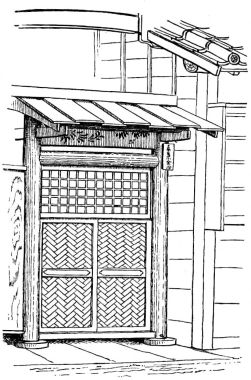 The accompanying sketch (fig. 33) represents a group of houses bordering a street in Kanda Ku, Tokio. The windows are in some cases projecting or hanging bays, and are barred with bamboo or square bars of wood. A sliding-screen covered with stout white paper takes the place of our glass-windows. Through [pg 51] these gratings the inmates of the house do their bargaining with the street venders. The entrance to these houses is usually by means of a gate common to a number. This entrance consists of a large gate used for vehicles and heavy loads, and by the side of this is a smaller gate used by the people. Sometimes the big gate has a large square opening in it, closed by a sliding-door or grating,—and through this the inmates have ingress and egress.