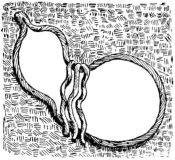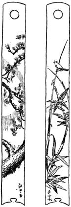 The sumi-tsubo was much more simple and primitive in form in those times, judging from the sketch given on page 42 (fig. 30, C). A carpenter's tool-box is shown quite as small and light as similar boxes in use to-day. To the cover of this box (fig. 32) is attached a curious hand-saw with a curved edge. Large saws with curved edges, having handles at both ends, to be worked by two men, are in common use; but I have never seen a hand-saw of this shape. All the saws represented in the picture had the same curved edge.