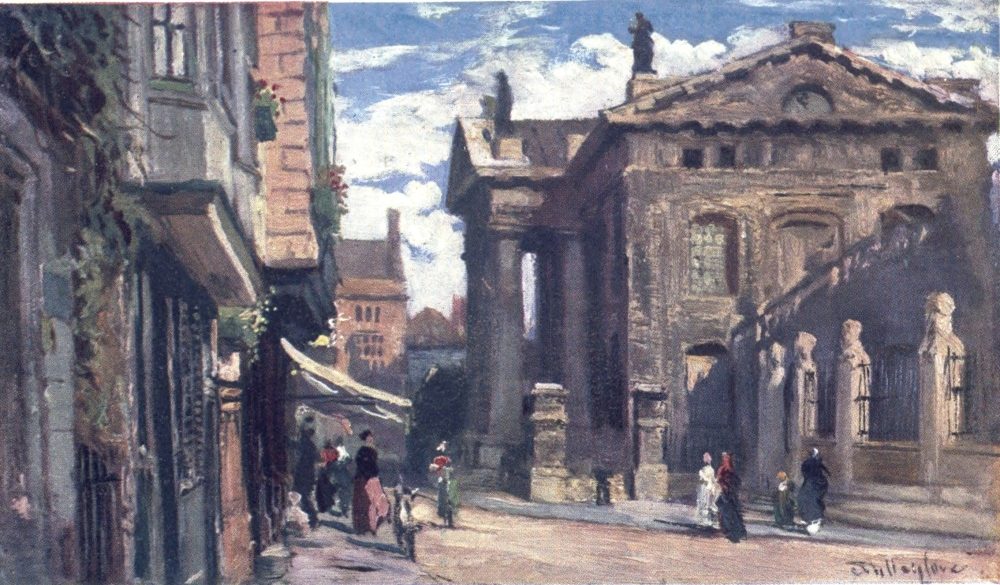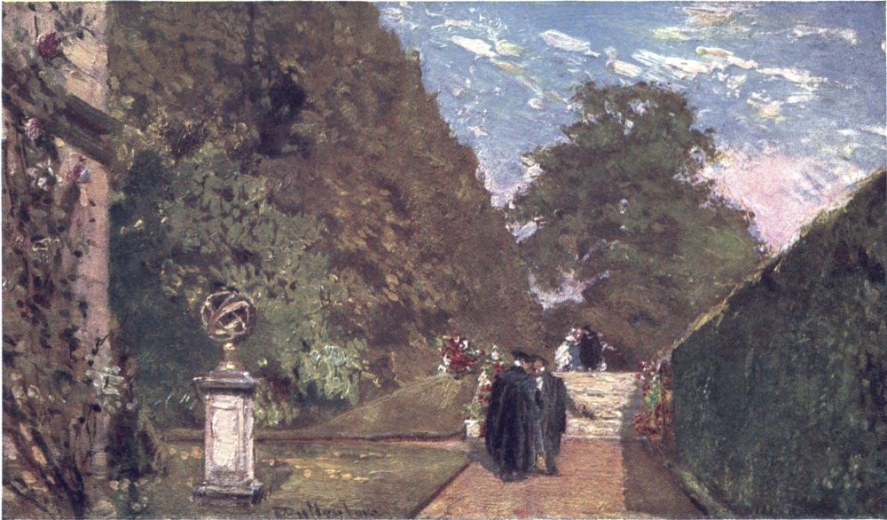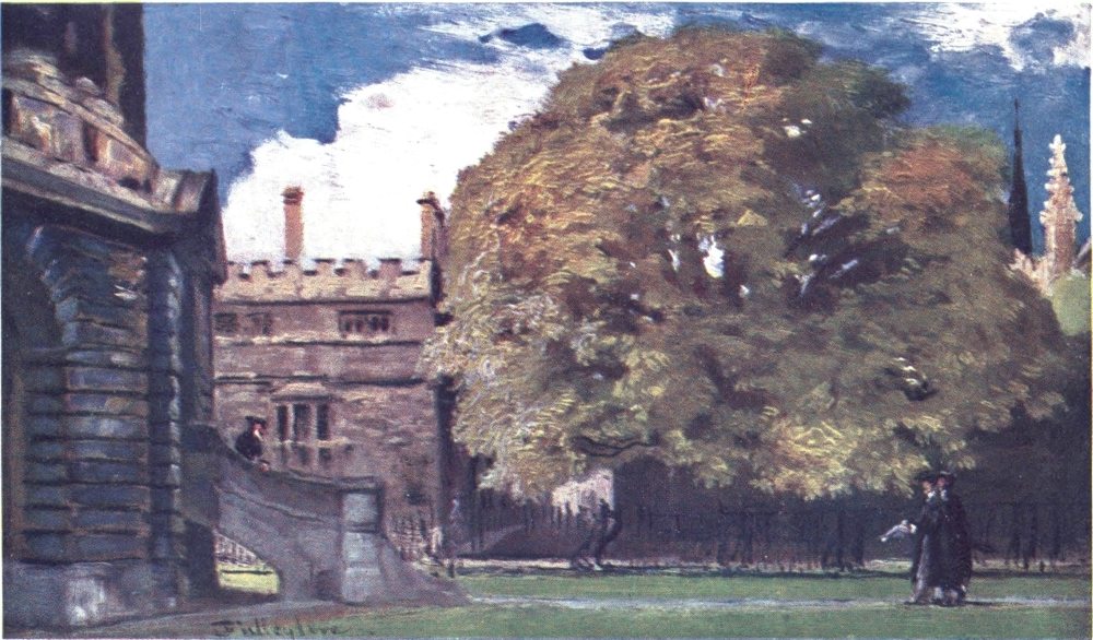 Some time ago I went into a grey quadrangle, filled[Pg 35] with gusty light and the crimson of creeper-leaves, tremulous or already in flight. A tall poplar, the favourite of the months from April to October, was pensively distributing its foliage upon the grass. There, the leaves became invisible, because of brilliant frost, and in a high attic I heard once again the laud or summons or complaint of bells. That was All Saints’; that, St. Mary’s; that, the Cathedral’s; and that was their blended after-tone, seeming to come from the sky. Each bell had its own character or mood, sometimes constant, sometimes changing with the weather of the night. One, for example, spoke out sullenly and ceased, as if to return to musing that had been painfully interrupted. Another bell seemed to take deep joy in its frequent melodious duty—like some girl seated alone in her bower at easy toil, now and then lifting her head, and with her embroidery upon her knee, chanting joys past and present and yet to come. Once again I felt the mysterious pleasure of being in an elevated Oxford chamber at night, among cloud and star,—so that I seemed to join in the inevitable motion of the planets,—and as I saw the sea of roofs and horned turrets and spires I knew that, although architecture is a dead language, here at least it speaks strongly and clearly, pompous as Latin, subtle as Greek. I used to envy the bell-ringers on days of ancient festival or recent victory, and cannot wonder that old Anthony à Wood should have noted the eight bells of Merton as he came home from antiquarian walks, and would often ring those same bells “for recreatio[Pg 36]n’s sake.” When their sound is dead it is sweet to enter that peacefullest and homeliest of churchyards, St. Peter’s in the East, overlooked by St. Edmund’s Hall and Queen’s College and the old city wall. There is a peace which only the thrush and blackbird break, and even their singing is at length merely the most easily distinguishable part of the great melody of the place. Most of the graves are so old or so forgotten that it is easy—and in Spring it is difficult not—to perceive a kind of dim reviving life among the stones, where, as in some old, quiet books, the names live again a purged and untroubled existence.
