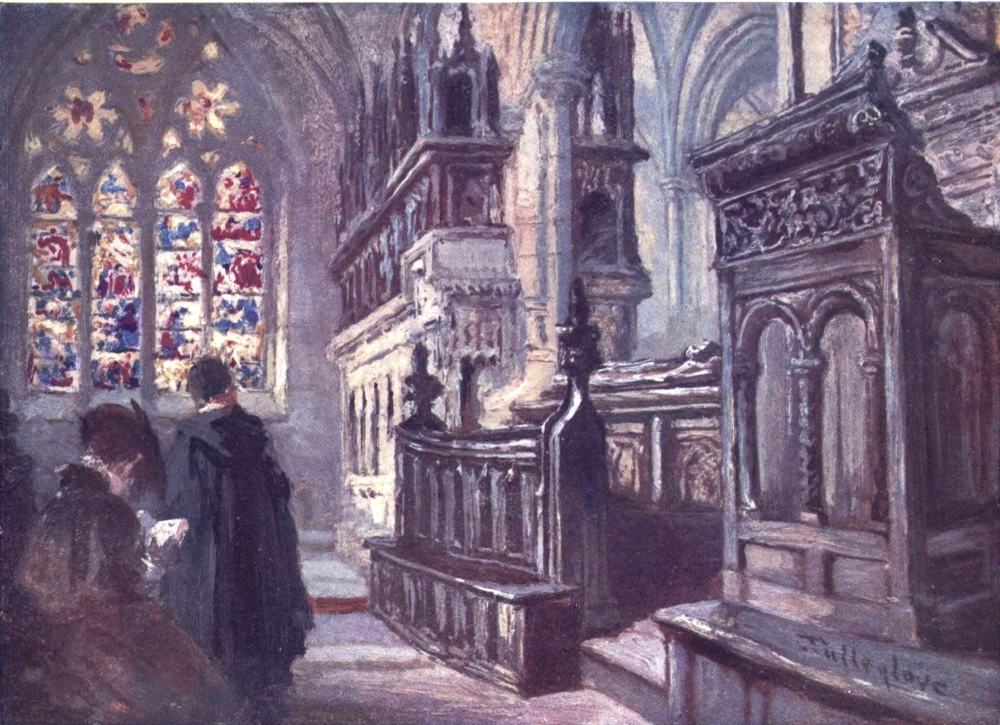 Once, answering the call of one of those bells that are to a scholar as a trumpet to a soldier, I found[Pg 42] myself at a service that had in it elements older than Oxford. I was surely at a Greek festival. The genial, flushed, slightly grotesque faces of the College fellows contrasted with the white children of the choir, very much as the swarthy faun with the young god in Titian’s “Bacchus and Ariadne.” The notes of the choristers and of the organ were moulded to finer results by the severe decorations of the carven stone around and above. When one sang alone, it was as it had been a dove floating to the windows and away, away. There were parts of the music so faint and so exquisitely blended that the twenty voices were but as the sound of a reverberating bell. A voice of baser metal read the lesson with a melancholy dignity that made the words at once pleasing and unintelligible. When the last surplice had floated past the exit, the worshippers looked a little pained and confused, as if doubting whether they had not assisted some beautiful rash heresy. Turning into High Street, I was rudely called back from a fantastic visit to Tempe, by the wind and rain of every day. The usual pageant of study and pleasure was passing up and down.