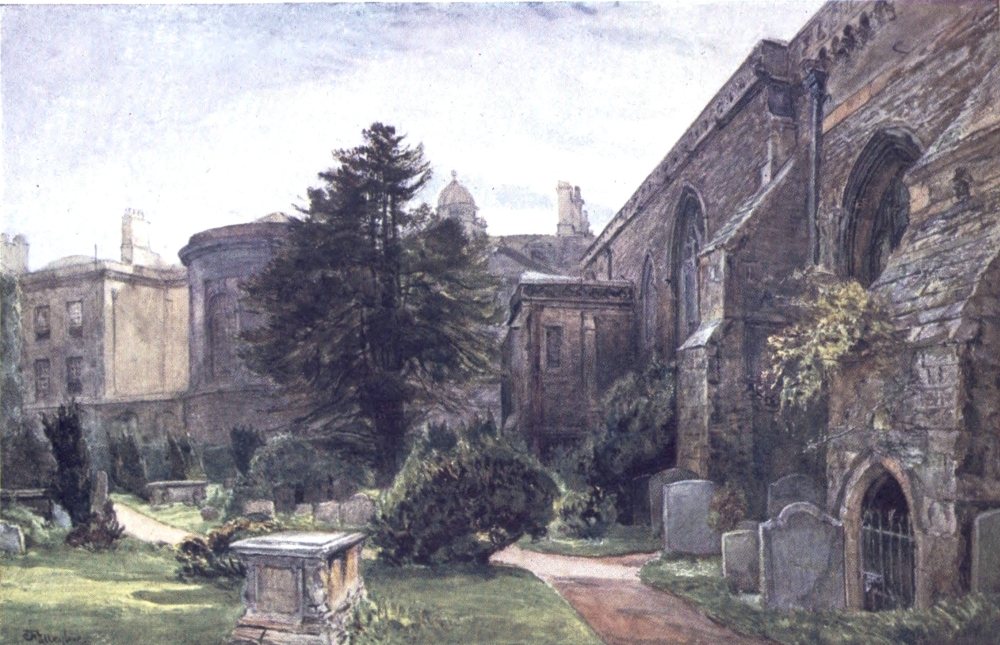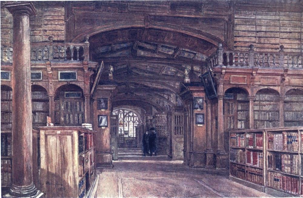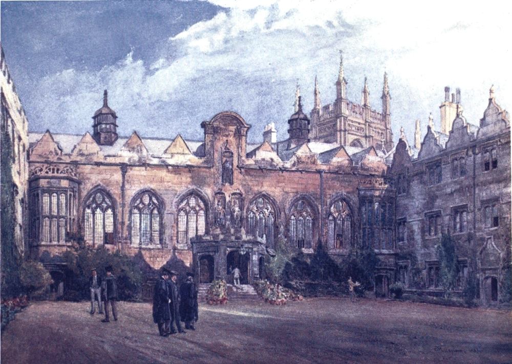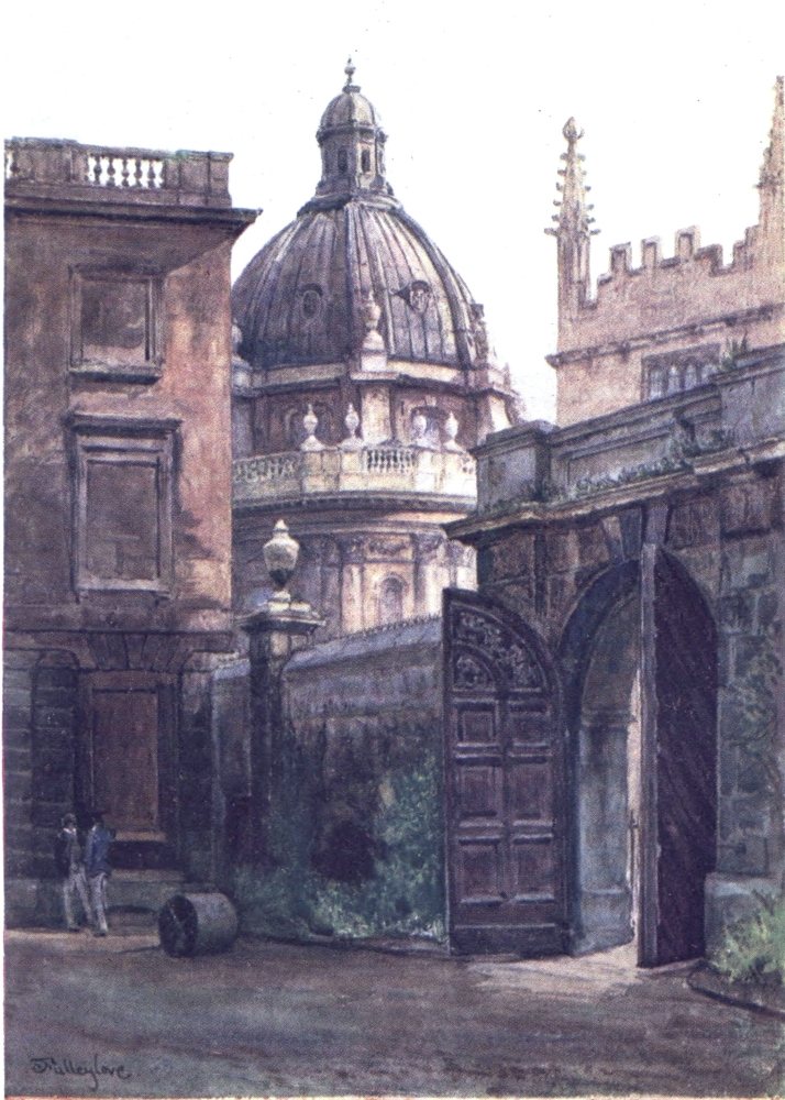 To the left are seen the steps leading to the Radcliffe Library, over which appears a portion of the buildings of Brasenose College, divided by a lane from the gardens of Exeter College, in which the Bishop planted the chestnut tree named after him.