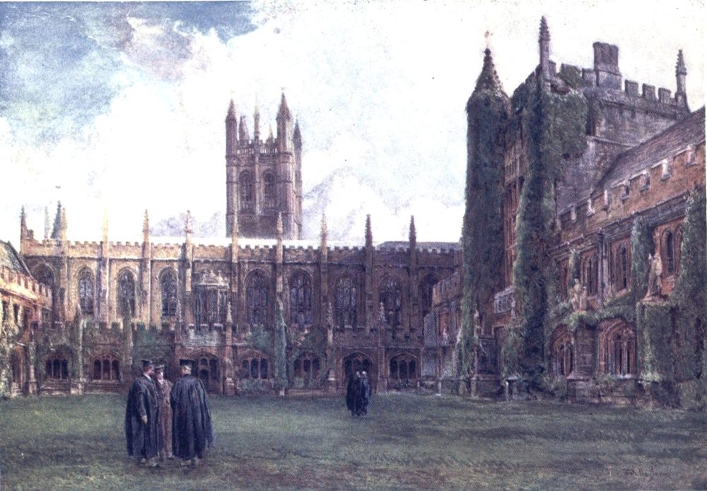 Let any one who has laughed at Oxford discipline, or criticised her system of education, go there in the morning early and be abased before the solemnity of that square lawn; and should he be left with a desire to explain anything, let him take up his abode with the stony mysterious beasts gathered around that lawn. I like that grass amidst the cloisters because it is truly common. No one, I hope and believe, except a gardener, an emblem, is permitted to walk thereon. It belongs to me and to you and to the angels. Such an emerald in such a setting is a fit symbol of the university, and its privy seal.