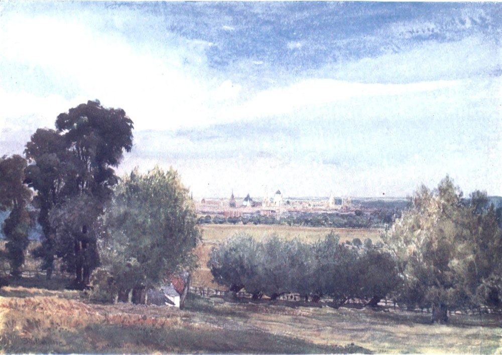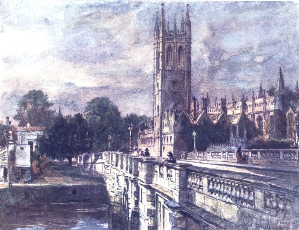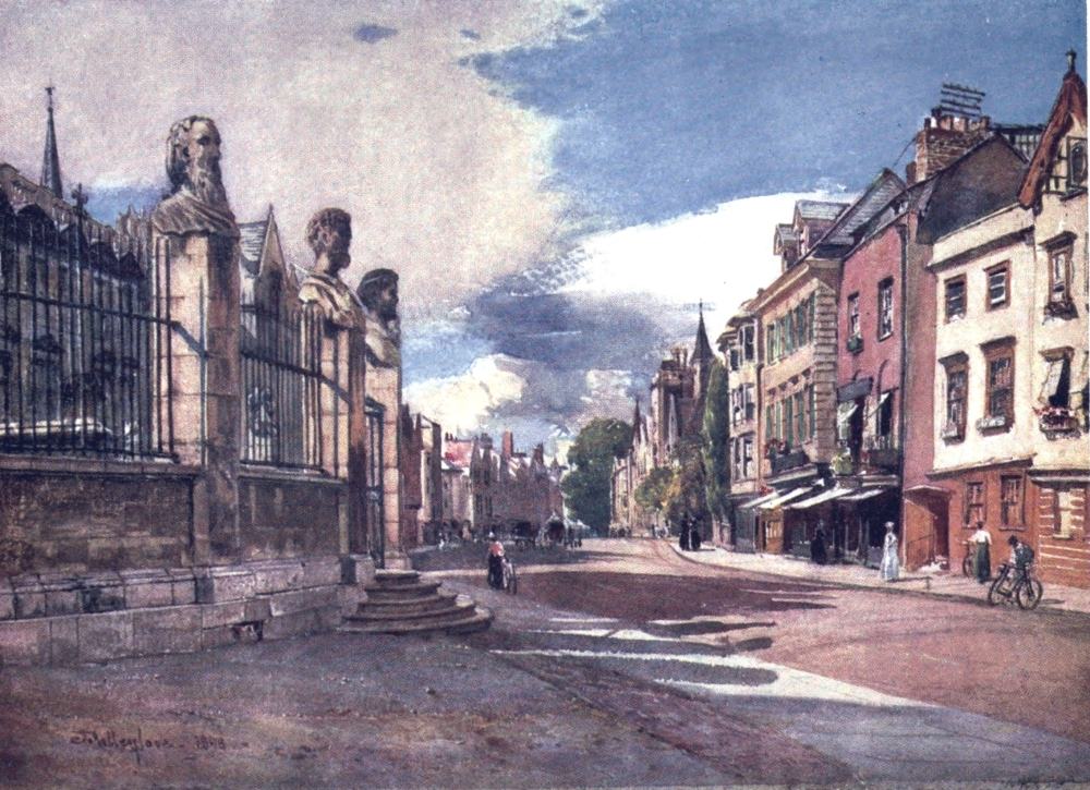 The elm trees of the “Grove” of Magdalen College show to the extreme left of the picture. The buildings of the College do not appear.