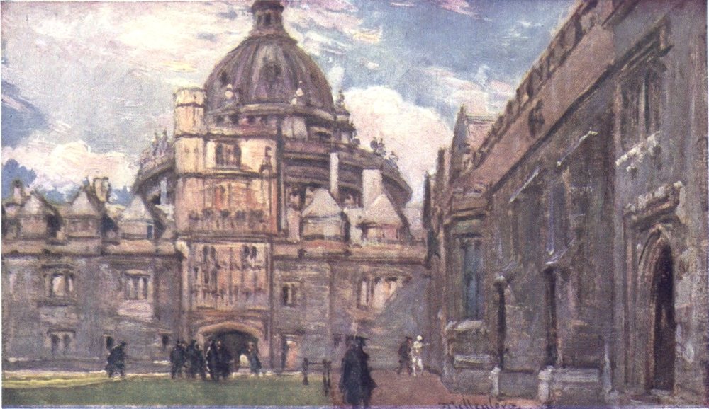 On the extreme left of the picture shows the roof of the Schools; the dome of the Radcliffe Library, St. Mary’s tower and spire, and Merton tower, occupying the centre of the picture.