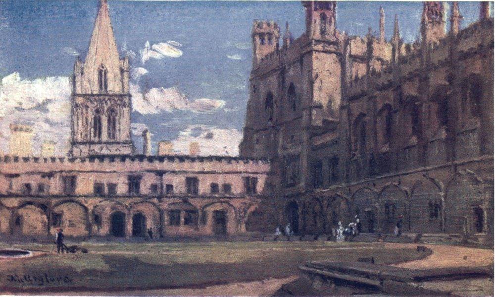 “Oxford ... must remain its own sole expression; and those whose sad fortune it may be never to behold it have no better resource than to dream about grey, weather-stained, ivy-grown edifices, wrought with quaint Gothic ornament, and standing around grassy quadrangles, where cloistered walks have echoed to the quiet footsteps of twenty generations,—lawns and gardens of luxurious repose, shadowed with canopies of foliage, and lit up with sunny glimpses through archways of great boughs,—spires, towers, and turrets, each with its history and legend,—dimly magnificent chapels, with painted windows of rare beauty and brilliantly diversified hues, creating an atmosphere of richest gloom,—vast college halls, high-windowed, oaken-panelled, and hung around with portraits of the men in every age whom the University has nurtured to be illustrious,—long vistas of alcoved libraries, where the wisdom and learned folly of all time is shelved,—kitchens (we throw in this feature by way of ballast, and because it would not be English Oxford without its beef and beer) with huge fireplaces, capable of roasting a hundred joints at once,—and cavernous[Pg 516] cellars, where rows of piled-up hogsheads seethe and fume with that mighty malt-liquor which is the true milk of Alma Mater: make all these things vivid in your dream, and you will never know nor believe how inadequate is the result to represent even the merest outside of Oxford.”—Hawthorne.