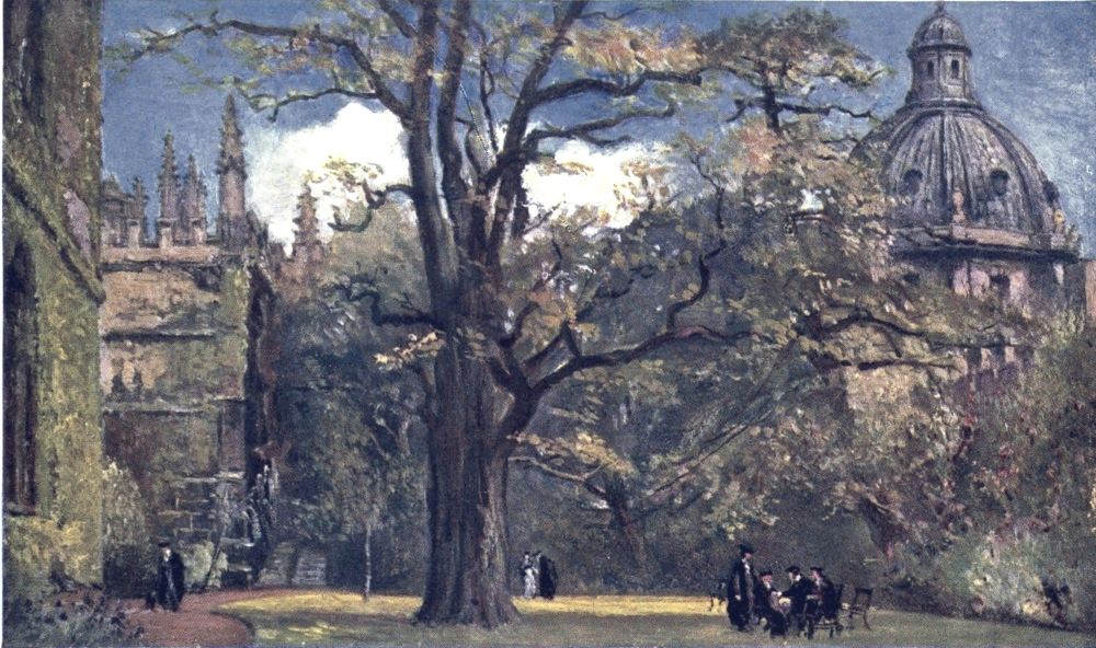 tree. William of Waynfleet commanded that Magdalen College should be built over against the oak that fell after six hundred years of life a century ago. Sir Thomas White was “warned in a dream” to build a college at a place where there stood a triple elm tree. Hence arose St. John’s College. Two hundred years ago the tree was known to exist, and there is ground for the pious belief that a scion still flourishes there.