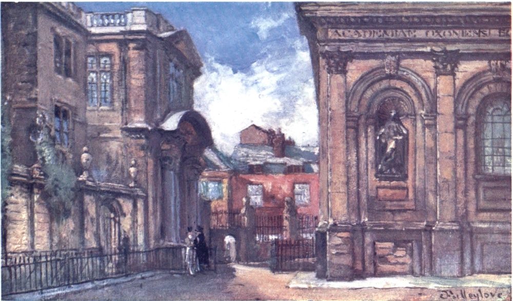 The Old Ashmolean Museum, with its noble entrance, stands to the left of the picture; on the right side is part of the south front of the Sheldonian Theatre.