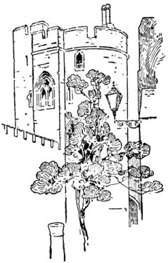 As you walk under the Curfew Tower, the Garter[15] Tower, the Salisbury Tower, in Thames Street, only the mass and outline announce antiquity; the streets, the names over the shops, even the old man who has dyed his white beard to get work as a scaffolder, look more ancient. Doubtless the jackdaws, gliding straight out into the clear air from the Round Tower, have been there since Creçy, but the stonework is new. That also is the work of George IV. Except St. George's Chapel, the timber and herring-boned brick of the Horse-shoe Cloister, and the stone houses of the Military Knights where men obviously live, and the tranquil and leafy Canons' Cloister at the top of the Hundred Steps, most of the exterior of Windsor looks and is new. There is little foliage on the walls, very little moss and green mould, and small space given to the festoons of the bellflower, which contrives its ivy-shaped humid leaves out of the driest stone. The thrush sings with a clear, wild note that seems scarcely earned by the barren hard walls. Even if searched for, ancient buildings are not numerous or easy to find. Part of the lower story eastward from the Devil's Tower, and some foundations, are of Henry II's time. From Henry III's more survives—the outer wall on the west and its three towers, the wall of the South Ambulatory in the Dean's Cloister, a door behind the altar of the chapel, the remains of the Domum[16] Regis on the north of the chapel in one of the Canons' houses, and the King's Hall, now a library. The work of Edward III and William of Wykeham gives its form to the Castle as a whole. Of Edward IV's work St. George's Chapel and the Horse-shoe Cloisters remain. St. George's Chapel is the finest and most perfect survival from the Castle as it was at the end of the middle ages. Ruskin called it "a very visible piece of romance". It is exquisite and elaborate. It holds and embalms the sunlight. It might be called hard, and the nave and aisles are at first sight a little cold on account of the lack of history, except for the mildly pathetic monument to George V of Hanover. But the choir, with its pomp of banners, the swords, helmets, mantels, and arms of the Garter Knights, is of an incomparable sombre gorgeousness. The groined vault of the nave of St. George's Chapel, and the Tudor buildings on the north side, and the south and east walls of the Tomb House, are Henry VII's; the groined vault of the choir at St. George's, and the entrance gateway, are Henry VIII's. The gallery and façade, with the postern at the west end of the North Terrace, are Elizabethan.