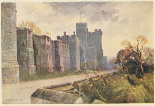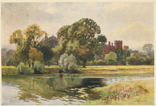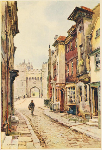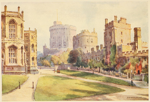 Celebrated places make a strong and often a visual impression upon the mind before they are seen either in reality or in picture. Windsor Castle, especially from the west and at some little distance, is one of those which confirm and even augment, when first seen, the mysterious vision of the imagination. Seen from the flat meadows of Clewer on a moist morning, when thrushes are singing in the elms, Windsor Castle rises up like a cloud in the east, with nothing behind, or on either side of it, but a sky of dull silver, and nothing below but the smoke wreaths of the town gently and separately ascending. It is like a cloud, a huge soft cloud, without motion yet full of change; and it is presently resolved into the predominant Round Tower, and[6] on one side of it the perpendicularly carved St. George's Chapel and the Curfew Tower, on the other side the cliffy, long front of the State Apartments. Even thus clear, the buildings are as remote as a cloud in a mental atmosphere of time and undefined associations. For these green meadows of Clewer belong to to-day. Behind their cheap fences they seem to expect the builder; they are edged by lowly and modern houses which vote Liberal and flutter white linen on the grey air. And on every hand the country is what it has been made within recent times. The river, the Court, and Eton College have changed the face of this countryside into something characteristic in every detail of a piece of England which is both attractive in itself and conveniently near London—almost within half an hour by rail and hardly more by road, if you ignore the law and the multitude. It is dotted with neat white-windowed houses of the rich and comparatively rich. The very dogs are wearing Conservative ribbons as they trot between their slouching red-faced masters and their delicately stepping indolent mistresses. The roads are many and excellent, and the beat of carriage horses' hoofs is a constant music, though interrupted by the motor car's hoot and throb and hiss. Every road is "as smooth as a die, a real stockjobber's road". For centuries the roads to Windsor must[7] have been exceptionally good; in Swift's time it was little more than a three-hours' journey from London. The inns are many. Bread and cheese and a drink cost half a crown, by paying which the visitor confers upon himself a companionship in a nameless but very honourable Victorian or Edwardian Order. There are many other instruments of civilization—railway stations, boathouses, Wellington College, the Royal Military College at Sandhurst, the Royal Holloway College for Women, not to speak of the racecourses at Ascot and at Windsor, and the Criminal Lunatic Asylum at Broadmoor, while Aldershot itself is really in the same district.