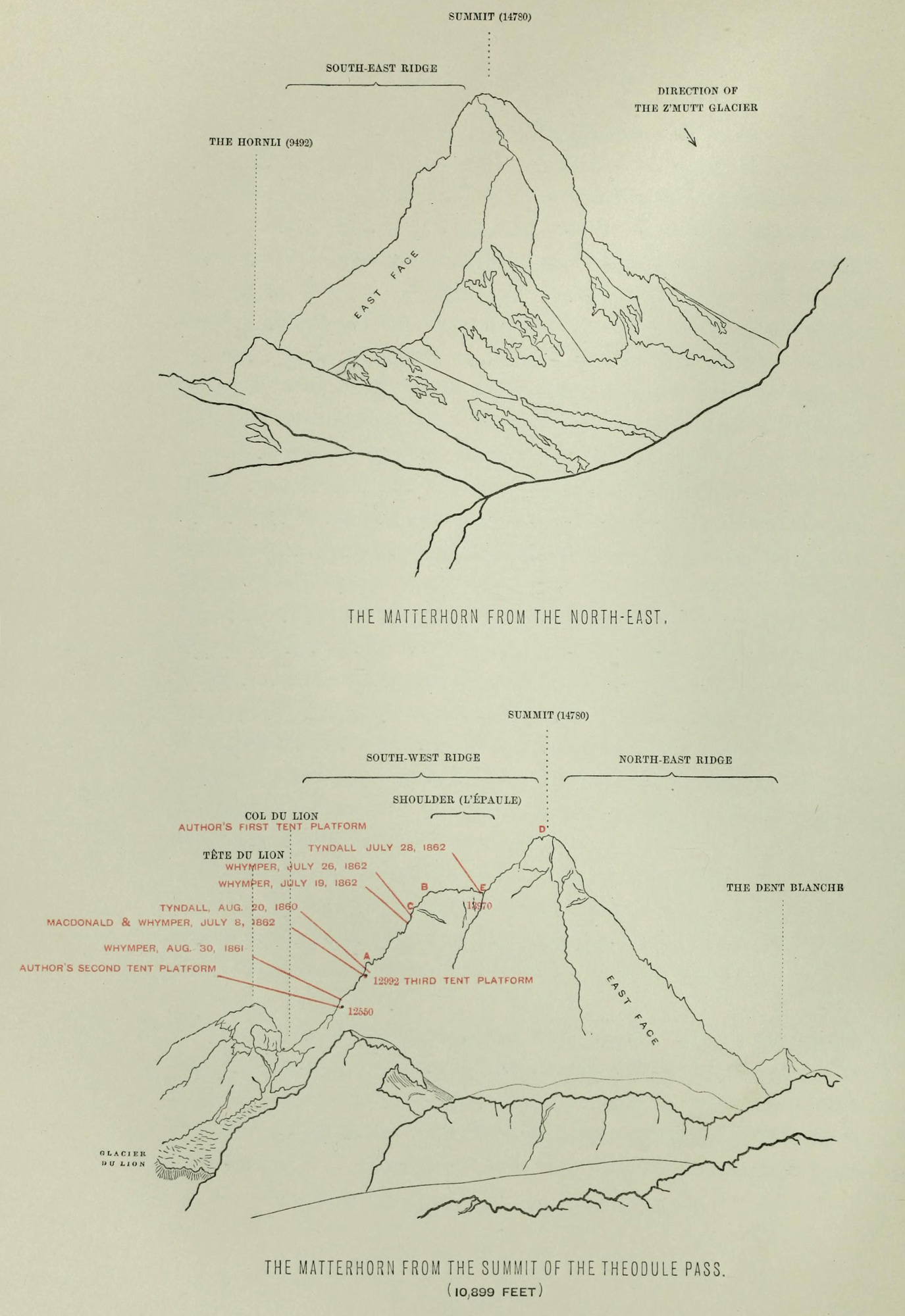 In the mean time they had not been idle upon the other side. A hut was constructed upon the eastern face at a height of 12,526 feet above the sea, near to the crest of the ridge which descends toward Zermatt (north-east ridge). This was done at the expense of Monsieur Seller and of the Swiss Alpine Club. Mons. Seller placed the execution of the work under the direction of the Knubels, of the village of St. Nicholas, in the Zermatt valley; and Peter Knubel, along with Joseph Marie Lochmatter of the same village, had the honor of making the second ascent of the mountain upon the northern side with Mr. Elliott. This took place on July 24 and 25, 1868. Since then numerous ascents have been made, and of these the only one which calls for mention is that by Signer Giordano, on September 3-5, 1868. This gentleman came to Breuil several times after his famous visit in 1865, with the intention of making the ascent, but he was always baffled by weather. In July, 1866, he got as high as the “cravate” (with J.-A. Carrel and other men), and was detained there five days and nights, unable to move either up or down! At last, upon the above-named date, he was able to gratify his desires, and accomplished the feat of ascending the mountain upon one side and descending it upon the other. Signor Giordano is, I believe, the only geologist who has ascended the Matterhorn. He spent a considerable time in the examination of its structure, and became benighted on its eastern face in consequence.
