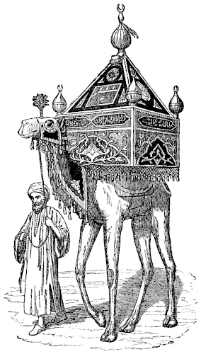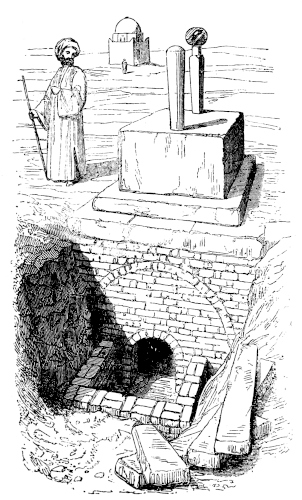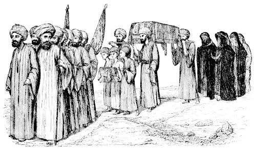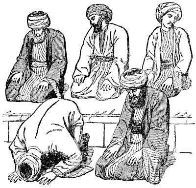 A short time since, upon his offering me a copy of the Kur-án for sale, he thought it necessary to make some excuse for his doing so. He remarked that, by my conforming with many of the ceremonies of the Muslims, I tacitly professed myself to be one of them; and that it was incumbent upon him to regard me in the most favourable light, which he was the more willing to do because he knew that I should incur the displeasure of my King by making an open profession of the faith of El-Islám, and therefore could not do it.[5] “You give me,” said he, “the“the salutation of ‘Peace be on you!’ and it would be impious in me, being directly forbidden by my religion, to pronounce you an unbeliever; for God, whose name be exalted, hath said, ‘Say not unto him who greeteth thee with peace, Thou art not a believer:’[6] therefore,” he added, “it is no sin in me to put into your hands the noble Kur-án: but there are some of your countrymen who will take it in unclean hands, and even sit upon it! I beg God’s forgiveness for talking of such a thing: far be it from you to do so; you, praise be to God, know and observe the command, ‘None shall touch it but they who are purified.’”[7]—He once sold a copy of the Kur-án, on my application, to a countryman of mine, who, being disturbed, just as the bargain was concluded, by some person entering the room, hastily put the sacred book upon the seat, and under a part of his dress, to conceal it. The bookseller was much scandalized by this action; thinking that my friend was sitting upon the book, and that he was doing so to show his contempt of it: he declares his belief that he has been heavily punished by God for this unlawful sale.—There was only one thing that I had much difficulty in persuading him to do during my former visit to this country: which xviiwas, to go with me, at a particular period, into the mosque of the Hasaneyn, the reputed burial-place of the head of El-Hoseyn, and the most sacred of the mosques in the Egyptian metropolis. On my passing with him before one of the entrances of this building, one afternoon during the fast of Ramadán, when it was crowded with Turks, and many of the principal people of the city were among the congregation, I thought it a good opportunity to see it to the greatest advantage, and asked my companion to go in with me. He positively refused, in the fear of my being discovered to be an Englishman, which might so rouse the fanatic anger of some of the Turks there as to expose me to some act of violence. I therefore entered alone. He remained at the door, following me with his eye only (or his only eye), and wondering at my audacity; but as soon as he saw me acquit myself in the usual manner, by walking round the bronze screen which surrounds the monument over the spot where the head of the martyr is said to be buried, and then putting myself into the regular postures of prayer, he came in, and said his prayers by my side.