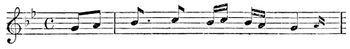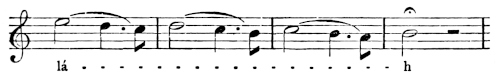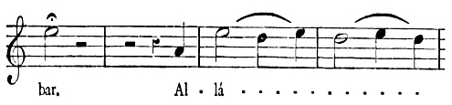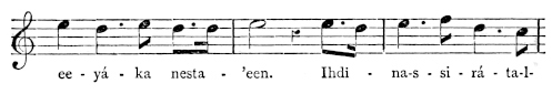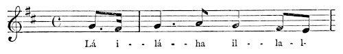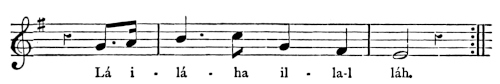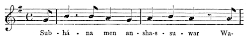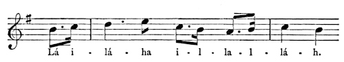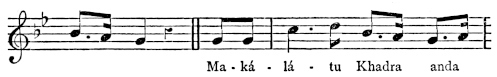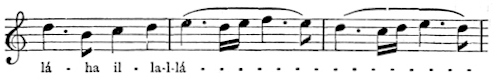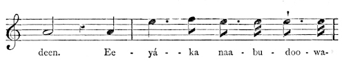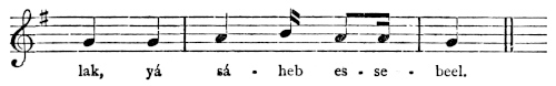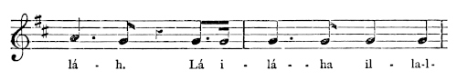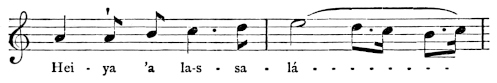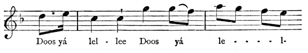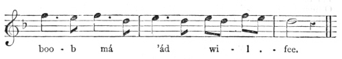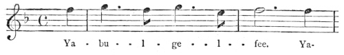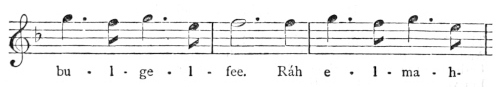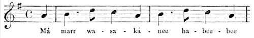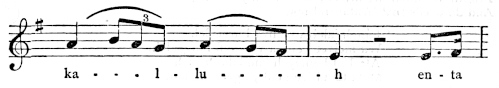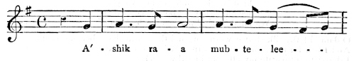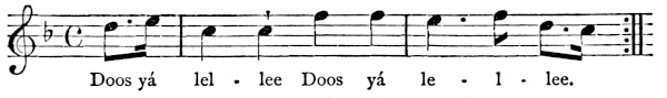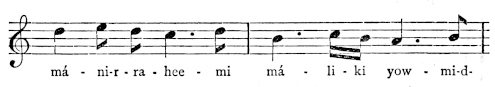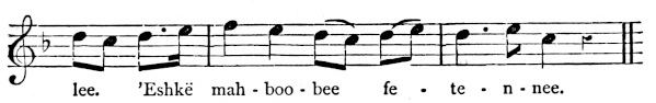 There are a number of musical scores in the text, which appear here as images, with the lyrics given after each line. These are repeated in a light green block, including hyphens to render the phrasing. Several of the songs are followed by the complete lyrics as poetry.