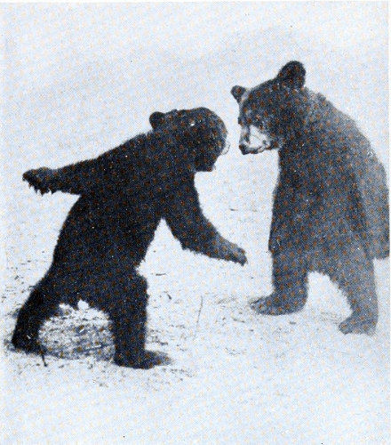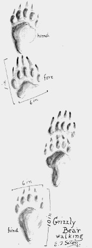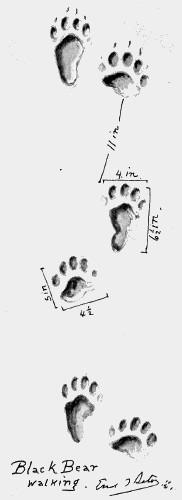 The plantigrade foot is clearly shown in the bear track. That of a black bear differs from that of a grizzly, first in size, second in the shortness of the claws. Usually no claws show, and the fifth toe, which is well developed on both front and hind paws, leaves little sign and often none at all. Frequently the hind foot is set on the track of the front foot in correct register. 609