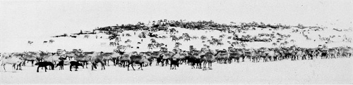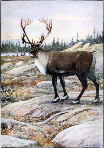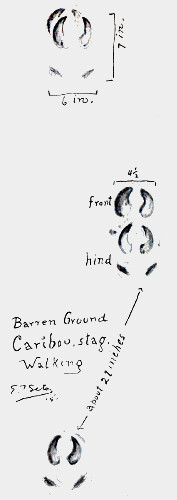 The caribou track is distinguished by its great spread and the fact that the clouts or hind hoofs touch the ground, even on a hard surface. I know of no difference but size between the tracks of the various caribou and reindeer. The probabilities of time and locality help in determining the species, but it need never be mistaken for that of any other type of deer. In winter the caribou’s tracks in the snow show that its feet, instead of being raised high at each step, like those of a Virginia or mule deer, drag through the snow like those of domestic cattle. 611