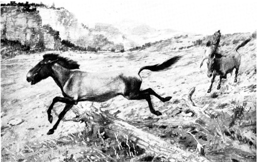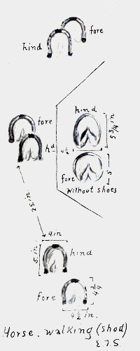 A hunter needs to know horse tracks as much as those of wild game. The greater size and roundness of horse tracks distinguish them from those of mules and asses. When shod the toe calks are a strong feature; when without shoes the unbroken front edge is distinctive. Some horses walk in correct register; some do not. Mules are more exact than horses. When trotting the arrangement is much as in walking, but the spaces are longer and the hind-feet track farther ahead of the front feet. In galloping the arrangement is much as in the white-tailed deer.