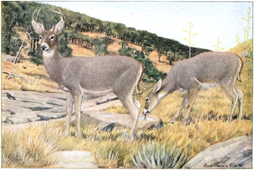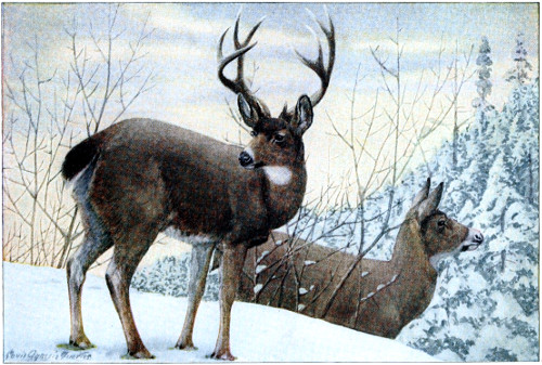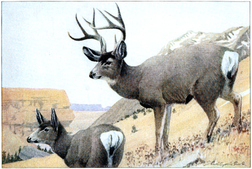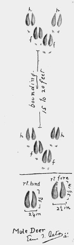 The mule deer tread cannot be distinguished with certainty from that of white-tailed or coast deer; yet it averages larger than either of these, and the curious close set together of all four feet while it does its peculiar bounding is quite unlike what we see in the white-tail track. “These deer are not good runners in the open. On level country in Arizona I have ridden after and readily overtaken parties of them within a mile. The moment rough country was reached, however, with amazing celerity a series of mighty leaps carries them away” (see page 456). 608