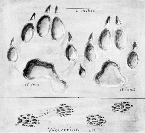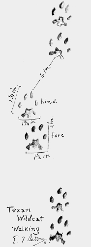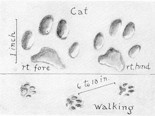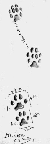 This track, while akin to that of a cat (see page 487), has some very well-marked characteristics. The complicated outline of the heel-pads is striking. This, with its large size, will distinguish it from the track of a house cat. The claws do not show. 1