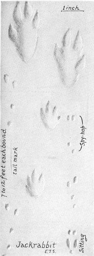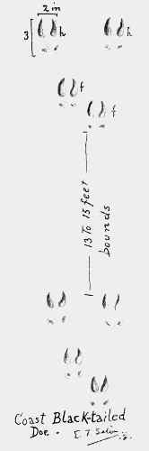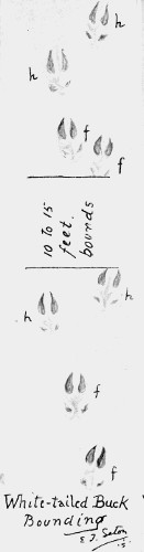 I know of nothing but probabilities to distinguish the walking tracks of the coast deer from those of nearly related species. This track of a bounding female shows a peculiar grouping that corresponds fairly with the bounding action characteristic of the species.