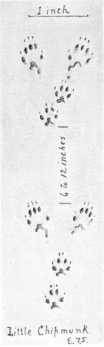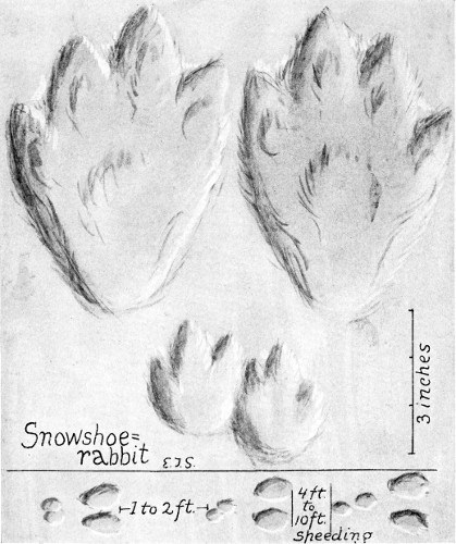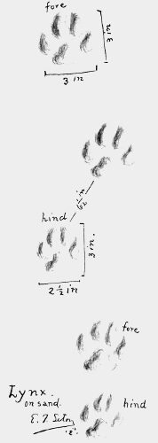 This track I sketched on the Athabasca River. In summer the track of a lynx shows the toe-pads faintly; in winter all are muffled in hair and the track is much larger. “The feet in winter are so broad that they serve admirably for support in deep snow” (see page 409).