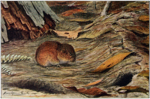 No cessation of their activity occurs in winter. When the cold weather begins many gather about barns and houses located near woods or old fields, and thus with the field mice take advantage of the garnered food supplies and shelter. Others remain in their regular haunts, where they frequently burrow long distances in the snow, making networks of tunnels and traveling long distances just below the surface, leaving little raised ridges like the track of a mole on the ground. Their journeys upon and under the surface of the snow appear to be in search of food, as they burrow down to old logs and stumps which make good feeding grounds. Their movements are very active, as they go about either at a walk or quick trot.