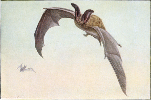 The marvelous variations in structure of the ears and other organs about the heads of insect-eating bats serve probably as microphones by which the flight of their prey may be detected and its direction located with instantaneous certainty. The beautiful accuracy with which this hearing mechanism works must be evident to any one who will take a position where he may have the evening glow of the western sky as a background for flights of bats. It is certain that the small and ineffective eyes these animals possess could never locate their minute flying game and enable them to secure it in the whirling, zigzag courses they pursue, often at a speed and under a control which few, if any, birds could rival.
